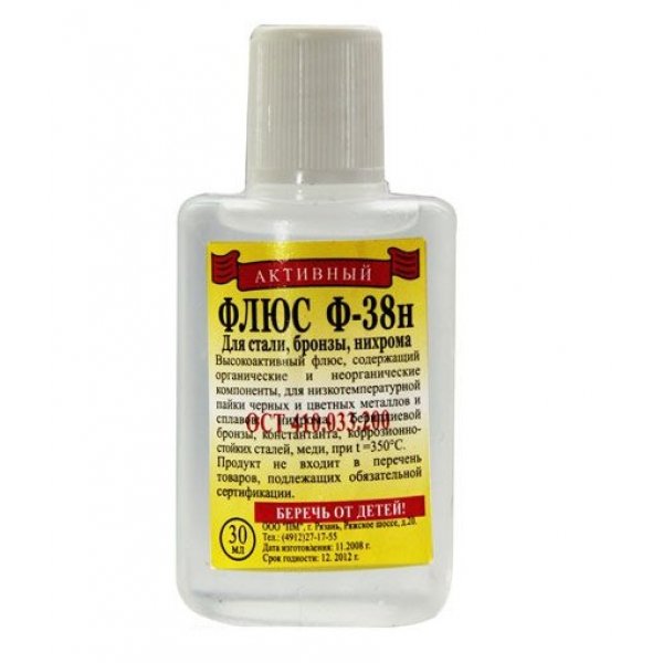 Высокоактивный флюс для низкотемпературной пайки. Применяется для пайки нихрома, константа, бериллиевой бронзы, коррозийно-стойкой стали, медных сплавов, бронзы, латуни. Остатки флюса легко смываются водой. Температурный интервал активности: 200-300С. Состав: ортофосфорная кислота, глицерин, этиленгликоль, диэтиламин солянокислый. (Активный)