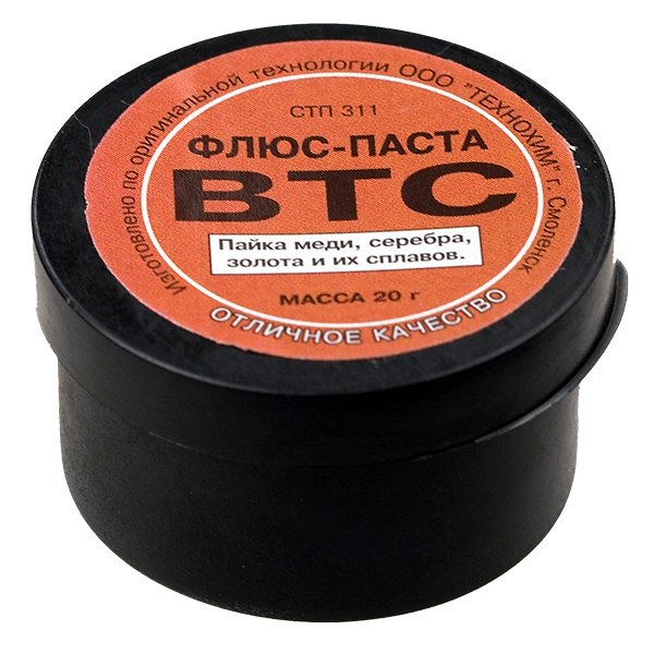 ВТС - активный флюс для пайки меди, серебра, золота и их сплавов. Изготовлен на основе органических кислот, благодаря чему действует в основном на окислы и загрязнения а не на сам металл. Состав: 63% технического вазелина, 6,3% триэтаноламина, 6,3% салициловой кислоты и этилового спирта. Остатки флюса удаляют протиркой детали спиртом или ацетоном.
