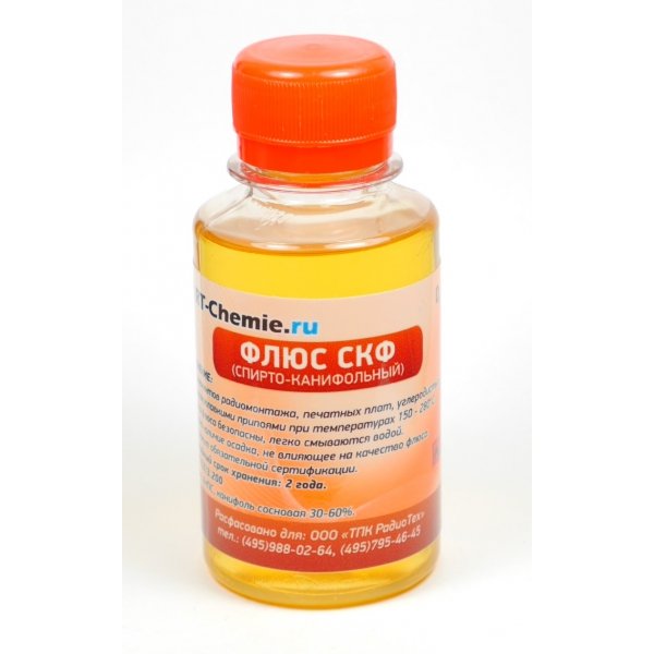 Простой и эффективный флюс. Применяется для пайки печатных плат и радиокомпонентов. Состав: спирт 60%, канифоль 40%, абсолютно нейтрален, не требует промывки после пайки.(Нейтральный). Изготовляется по ОСТ 4Г 0.033.200.