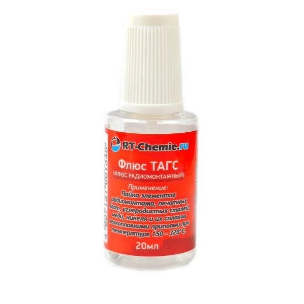 Флюс радиомонтажный, глицериновый. Применяется для пайки элементов печатных плат. При пайке имеет остаточное сопротивление. Требует промывки водой или спиртом.(Водосмываемый). Состав: глицерин, анилиновый активатор.