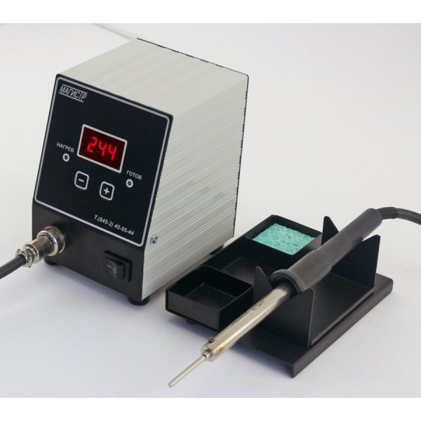 Профессиональная паяльная станция «Магистр Ц20». Блок управления станции 16 раз в секунду измеряет температуру паяльника. Антистатическое исполнение и прочный металлический корпус. Диапазон температур 50- 350 °С. Точность поддержания температуры +/- 2 °С. Регулировка Цифровой ПИД регулятор.