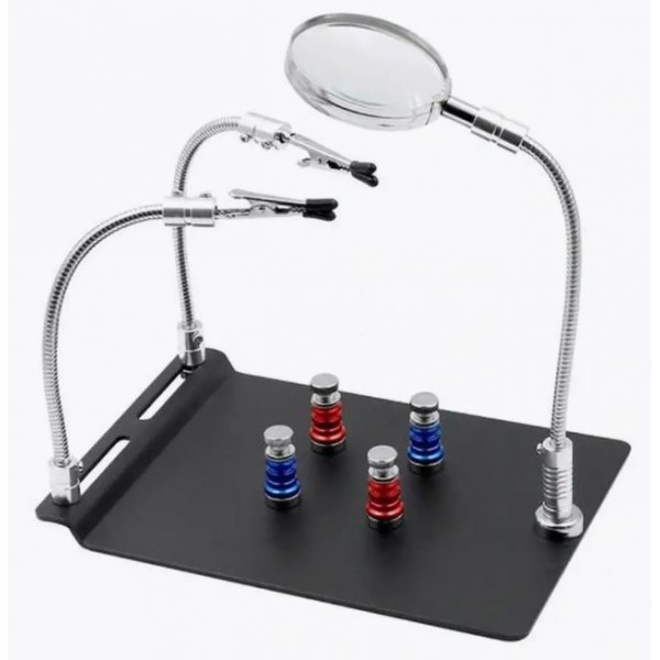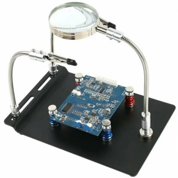 Держатель платы с гибкими возможностями, его легко подстроить под себя, так как фиксация лупы и держателей плат выполняются с помощью мощных магнитов. Это значит что вы можете зафиксировать объект любой формы и размеров, а лупу разместить там где вам будет удобней, легко и быстро. Размеры основания: 210*145*12мм. Размер линзы: 62мм