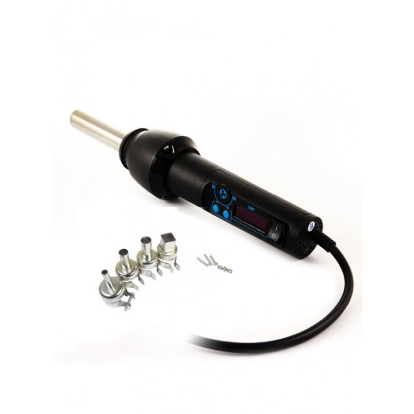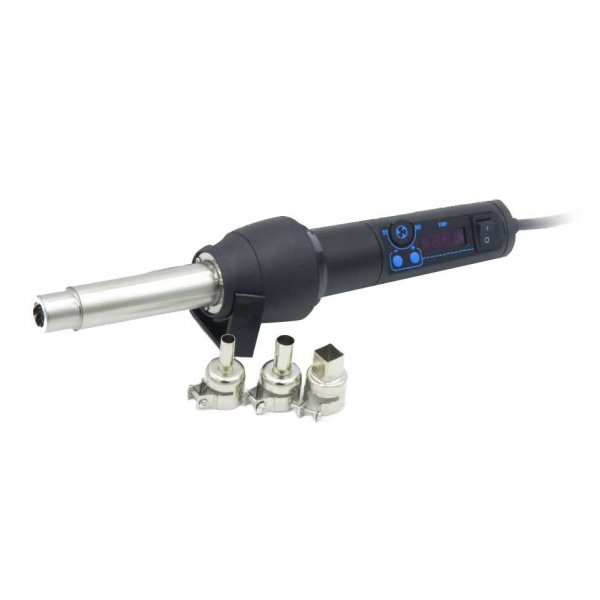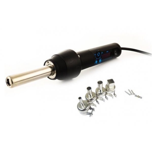 Управление фена на ручке. Отсутсвует блок управления, благодаря чему: обладает малыми размерами и весом, удобен в эксплуатации. Подходит для пайки различных компонентов, в том числе SOIC, PLCC, QFP и BGA. Фен оснащен LED-дисплеем, на котором отображается установленная температура, что позволяет лучше контролировать рабочий процесс. Температурный диапазон: 100-480 °C. Производительность вентилятора (max): 120 л/мин. Тип воздушного потока: прямой. Длина рукоятки с кабелем: 1,4 метра. В комплекте 4 насадки. Мощность фена: 650вт.