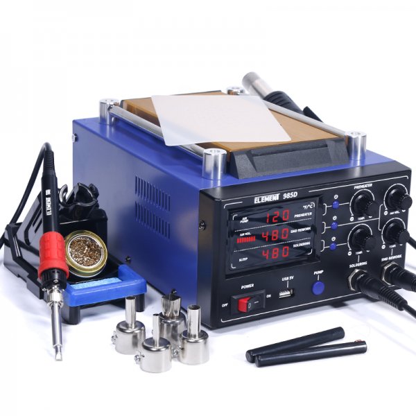 PID замкнутая система датчиков, микроконтроллер для цифрового отображения данных и контроля температуры, большая стартовая мощность, быстрый разогрев, стабильность температуры с точностью до 1°C, на которую не влияет объем выдуваемого воздуха. Все эти преимущества делают пайку и демонтаж базопасными для таких чувствительных компонентов, как SOIC, PLCC, QFP, BFA и т.д.