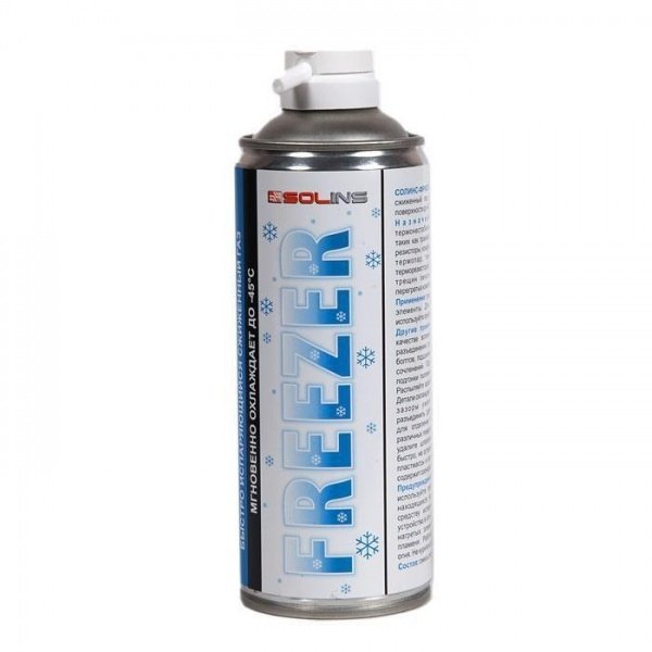 Средство для быстрого охлаждения (до -50°С). Применяется для обнаружения вышедших из строя компонентов и для охлаждения термочувствительных устройств. Препарат химически чист, стремительно испаряется, не оставляя следов. Спрей Фризер не содержит хлорфторуглеродов и гидрохлорфторуглеродов, и, следовательно, имеет нулевой озоноразрушающий потенциал.