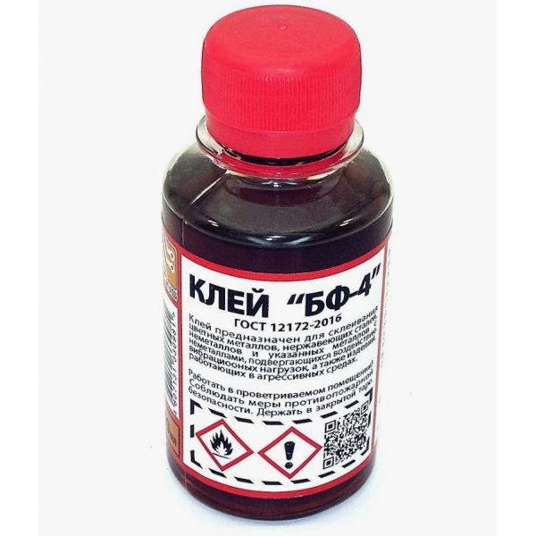 клей предназначен для склеивания цветных металлов, нержавеющих сталей, алюминиево-магниевых сплавов, меди, текстолита, стеклопластиков, оргстекла, кожи, керамики, древесных материалов, неметаллов с металлами и т.д. подвергающихся воздействию вибрационных нагрузок, а также для изделий, работающих в агрессивных средах. Рекомендован для работы при любых климатических устовиях при температуре от -60 до +60оC (кратковременно до +80оC). Клей не вызывает коррозии стали и алюминиевых сплавов. Клей БФ-4 представляет собой раствор поливинилбутираля (4%) с резольными фенолформальдегидными смолами в растворителе (абсолютированный этанол). Обладает большей эластичностью по сравнению с клеем БФ-2. ГОСТ 12172-2016