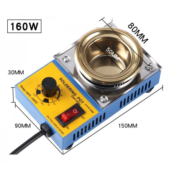 Габариты тигеля: D=50мм x 35мм(Н), 500г припоя. Диапазон рабочих температур 200-430С. Паяльная ванна CT-21C для лужения выводов малоразмерных электронных компонентов, в том числе демонтированных микросхем для повторного их использования.