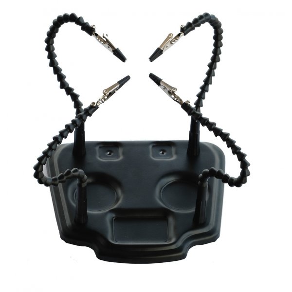Профессиональный инструмент для пайки и работы с мелкими платами и проводами. Используется в области электроники, моделирования и ювелирном деле. Имеет устойчивую металлическую платформу и 4 зажимва-крокодил на гибких подводках, жестко фиксирующие рабочую деталь.