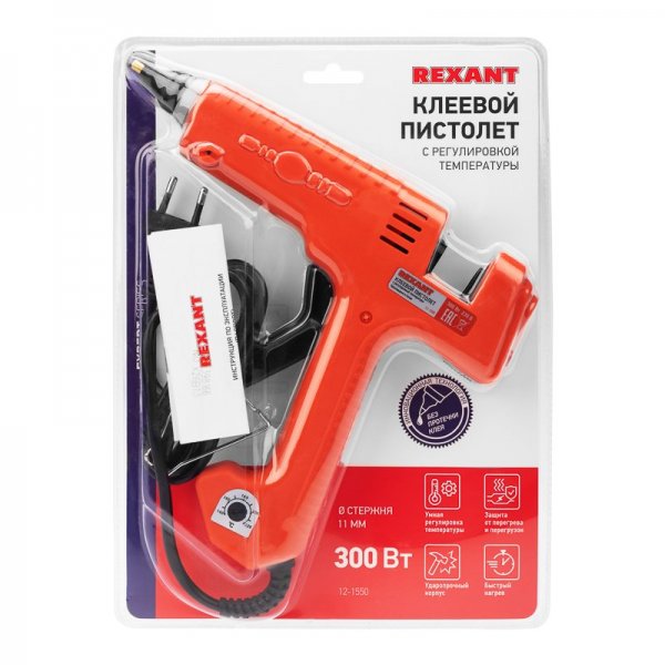 Пистолет клеевой REXANT (300 Вт, Ø11 мм, «ЭКСПЕРТ») предназначен для прочной фиксации поверхностей с помощью расплавленной клеевой массы.