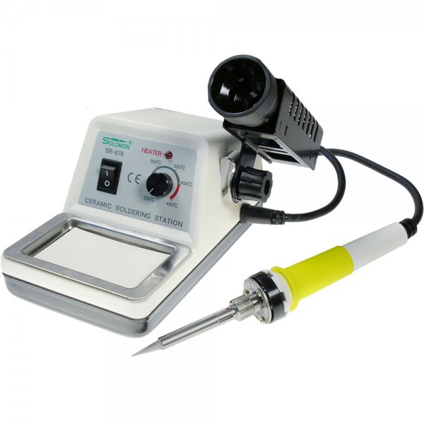 Обеспечивает быстрый нагрев (до 1,5 мин), автоматическое поддержание установленной температуры жала паяльника с точностью ±10°С и светодиодную индикацию выхода на заданный температурный режим. Точный контроль температуры осуществляется посредством сенсора, расположенного в корпусе керамического нагревательного элемента. Жало полностью изолировано от электронной схемы, что гарантирует безопасность работ с компонентами, чувствительными к статическому электричеству. В комплект станции входит основной блок с электронным регулятором температуры в пределах от 250 до 480 °C, держатель паяльника, губка для очистки жала паяльника, электрический паяльник мощностью 50 Вт на рабочее напряжение 220/240 В переменного тока с керамическим нагревательным элементом и металлокерамическим жалом.