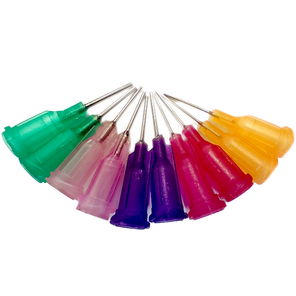 Высокоточные иглы из нержавеющей стали с основанием из двух слоев полипропилена. Иглы имеют внутреннюю обработку электрополировкой для беспрепятственного равномерного потока материала. Внутренние диаметры: 18G(зел)-0,84мм, 20G(роз)-0,6мм, 21G(фиол)-0,51мм, 23G(оранж)-0,34мм, 25G(красн)-0,25мм. Длина иглы 0,5 дюйма (1,27см). Комплект 10шт.