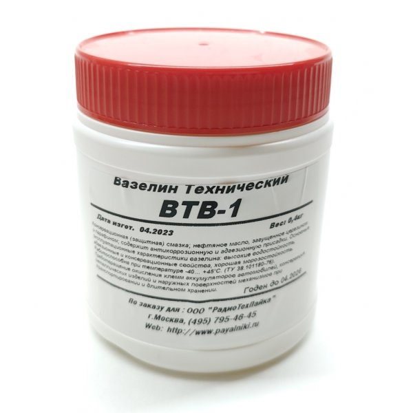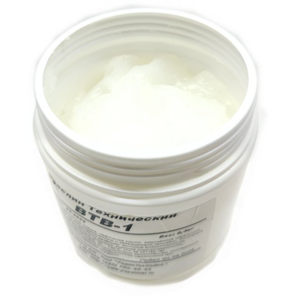 Смазка ВТВ-1 вазелин технический (ТУ 38.101180-76) — консервационная (защитная) смазка; нефтяное масло, загущенное церезином и парафином; содержит антикоррозионную и адгезионную присадки. Основные эксплуатационные характеристики вазелина: высокие водостойкость, адгезионные и консервационные свойства, хорошая морозостойкость. Работоспособна при температуре -40… +45°С.