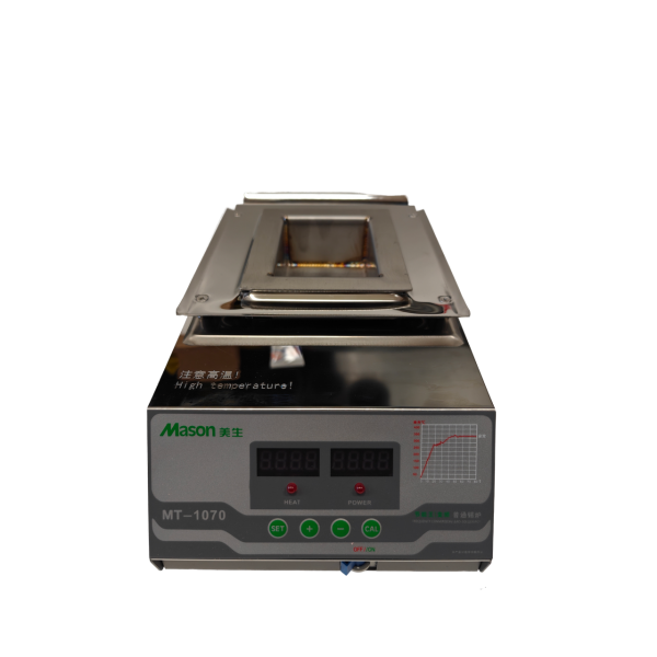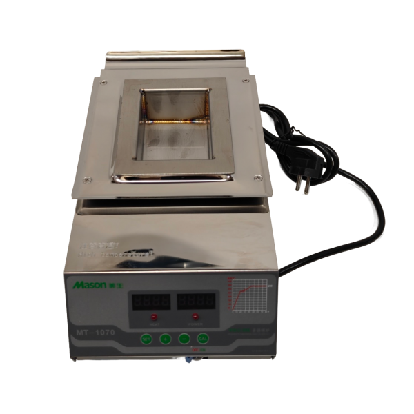 Габариты тигеля: 100мм х 70мм x 45мм(H), 2300г припоя. Диапазон рабочих температур 100-400С. Паяльная ванна Mason MT-1070 для лужения выводов малоразмерных электронных компонентов, в том числе демонтированных микросхем для повторного их использования. Усовершенствованная паяльная ванна нового поколения. В данной модели есть цифровая индикация температуры. Материал тигеля - нержавеющая сталь. Точная система регулировки температуры в широком диапазоне.
