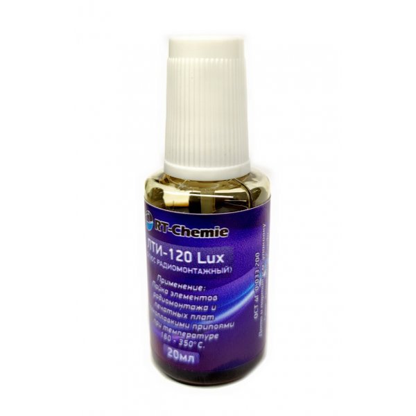 Улучшенный ЛТИ-120. Не содержит спирта. Не требует спирта или других растворителей для удаления остатков. Очень долго работает не испаряясь, благодаря чему, позволяет паять труднопаяемые материалы и теплоёмкие детали. Не оставляет твёрдых остатков после пайки. Флюс смывается водой.