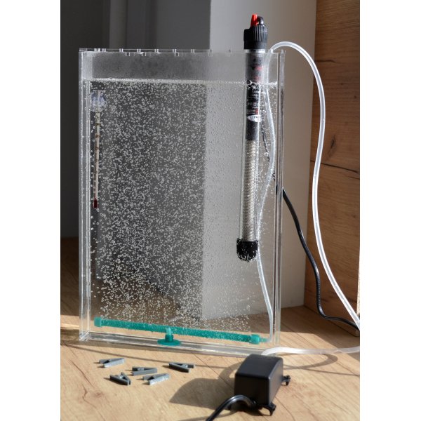 Скорость химической реакции тем быстрее, чем выше температура. Вертикальное расположение платы и перемешивание раствора улучшают доступ активного вещества к меди и отвод продуктов реакции. Раствор перемешивается пузырьками воздуха, который нагнетается в распылитель с помощью компрессора. Компрессор и нагреватель работают от сети 220 В.