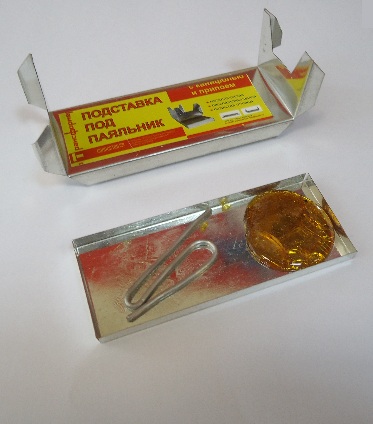 Раскладывающаяся металлическая подставка под паяльник, с канифолью и припоем. Универсальная. Загнуть одинаковые боковые части на 90 градусов относительно центральной части. Поставка для паяльника готова к работе! В специальном отсеке подставки находится канифоль и припой.
