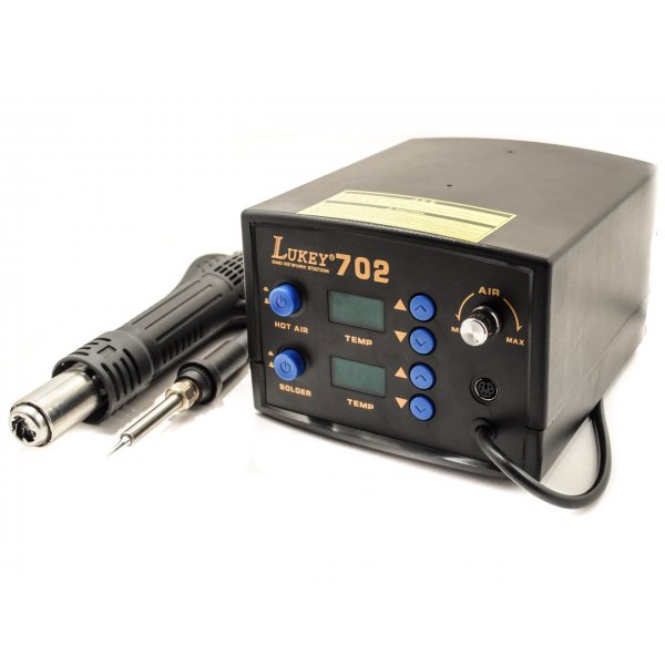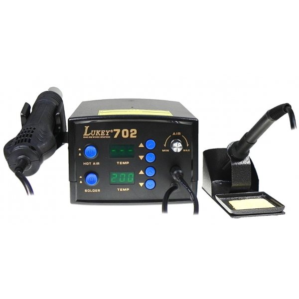 Паяльная станция LUKEY-702 (паяльник + термофен) применяется для демонтажа или пайки различных видов компонентов таких как SOIC, PLCC,QFP, BGA и т.д.