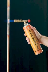 Компактная газовая паяльная лампа в комплекте с газовым баллоном KEMPER 600. Регулируемый подсос воздуха изменяет форму пламени и позволяет снизить температуру пламени на треть.