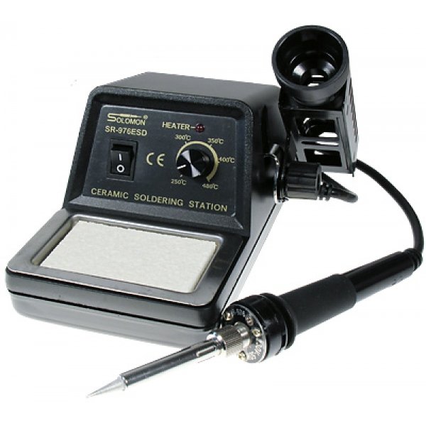 Обеспечивает быстрый нагрев (до 1,5 мин), автоматическое поддержание установленной температуры жала паяльника с точностью ±10°С и светодиодную индикацию выхода на заданный температурный режим. Точный контроль температуры осуществляется посредством сенсора, расположенного в корпусе керамического нагревательного элемента. Жало полностью изолировано от электронной схемы, что гарантирует безопасность работ с компонентами, чувствительными к статическому электричеству. В комплект станции входит основной блок с электронным регулятором температуры в пределах от 250 до 480 °C, держатель паяльника, губка для очистки жала паяльника, электрический паяльник мощностью 50 Вт на рабочее напряжение 220/240 В переменного тока с керамическим нагре- вательным элементом и металлокерамическим жалом. Паяльная станция SR-976ESD имеет схожие технические параметры с базовой моделью SR-976, оснащена дополнительным терминалом для заземления, имеет защиту от разрядов статического электричества и предназначена для пайки сверхчувствительных компонентов.
